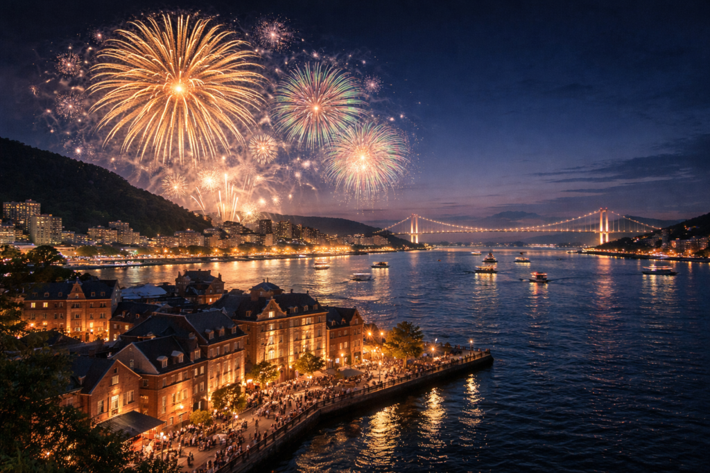 門司側から楽しむ関門海峡花火大会は、花火そのものの迫力に加えて、海峡の夜景や港町の雰囲気まで含めて満足度が高い大会です。写真映えを重視したい人や、花火だけで終わらず周辺散策も楽しみたい人に特に向いています。