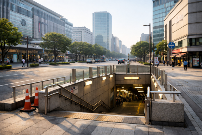 博多駅周辺は地下街や地下鉄コンコースが発達しているため、雨の日でもかなり移動しやすいエリアです。ただし、博多口地下駐輪場へ入る最終段階では地上出入口P4を目印にする必要があるため、ずっと完全屋内で完結する感覚でいると戸惑うことがあります。