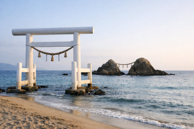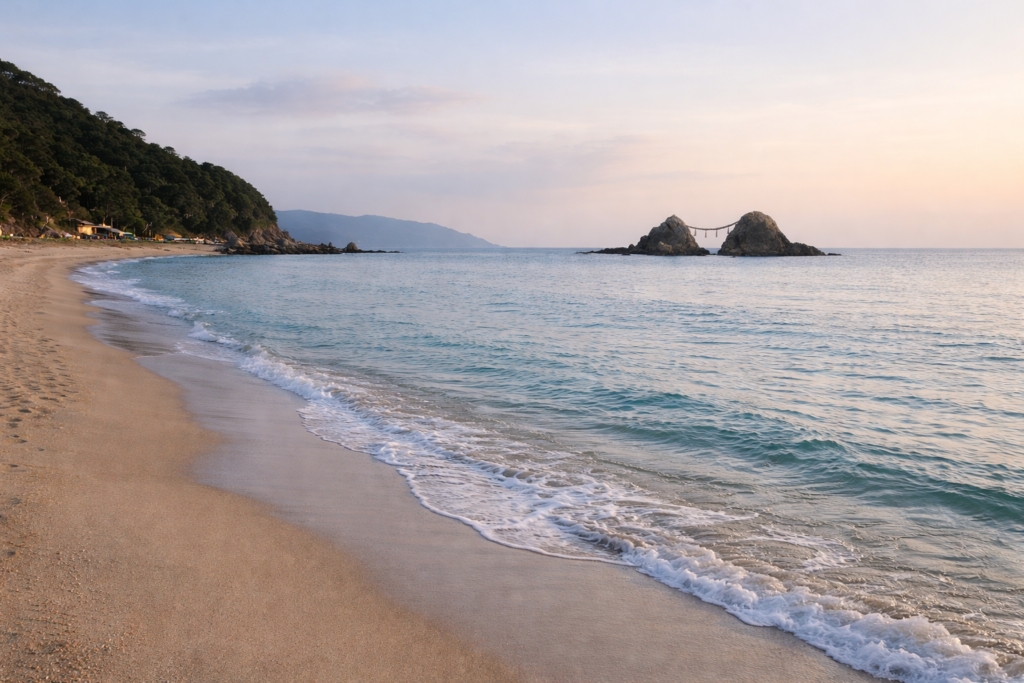 桜井二見ヶ浦は、糸島市志摩桜井にある定番の海辺スポットです。夫婦岩と鳥居で知られていますが、一人で訪れると、景色の派手さ以上に「波音の心地よさ」が残ります。バスなら二見ヶ浦(夫婦岩前)バス停を使いやすく、車なら有料駐車場があります。