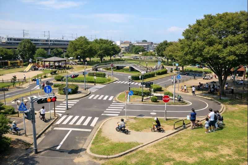 貝塚交通公園の大きな魅力は、園内に実際の道路を再現したコースが整備されている点です。信号機や一時停止の標識、横断歩道などが設置されており、子どもは遊びながら自然に交通ルールを体験できます。