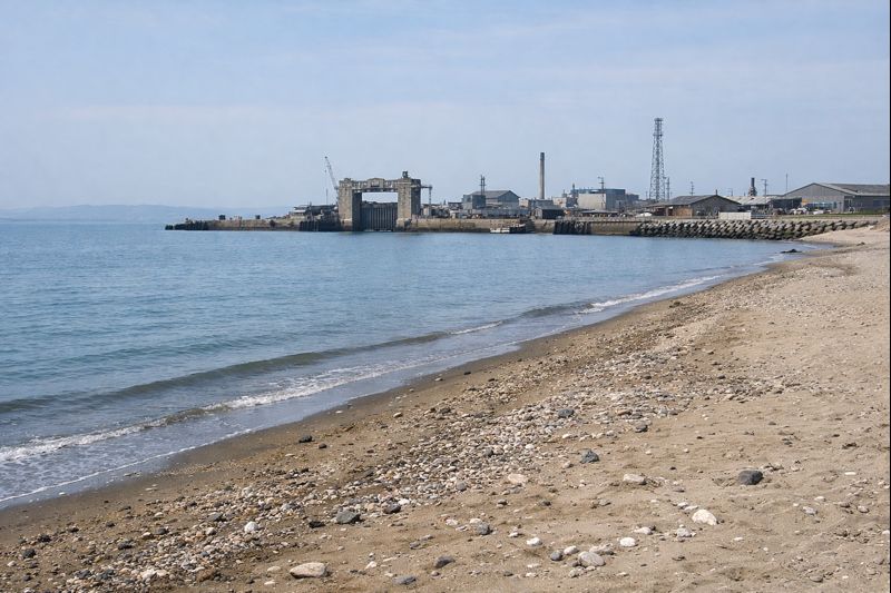 雰囲気は「海水浴場」というより、港のそばの海辺です。砂浜っぽい場所はあっても、遊泳向けの整備がある前提ではなく、海の景色と港湾の景色が同居する独特の空気感を楽しむタイプのスポットになります。