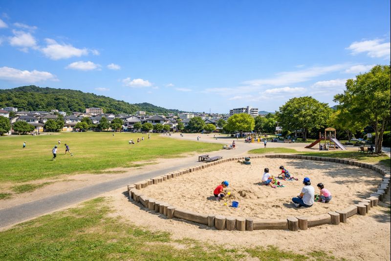 皿山中央公園は、広い球技広場と大きな砂場があり、子どもの年齢に合わせて遊び方を選びやすい公園です。住宅地にあるため落ち着いた雰囲気で、日常の外遊びに取り入れやすい点も魅力です。安心して楽しむために、年齢別のポイントと注意点を押さえておきましょう。