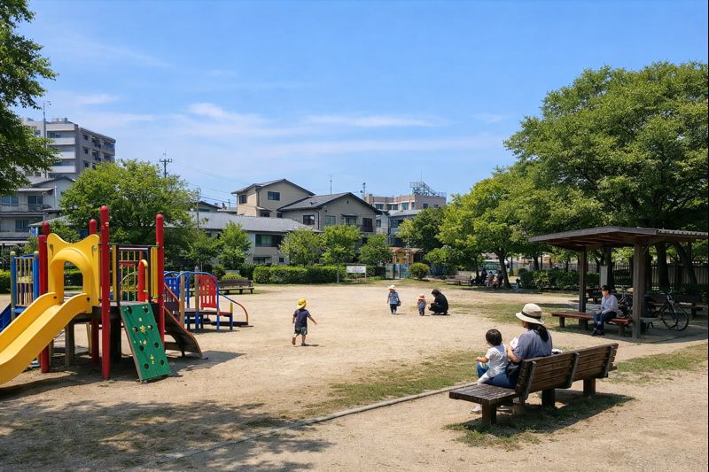 駅からは徒歩で約10分前後とされており、住宅街の中にあるため、落ち着いた雰囲気の中で過ごせます。周辺にはマンションや学校が多く、地元の子どもたちが日常的に利用している公園です。